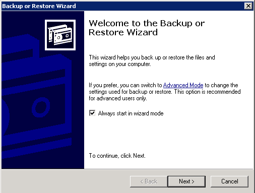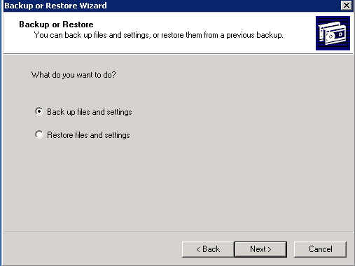 Empieza con un Wizard, el cual seguimos al pie de la letra. Luego, seleccionamos Back up files and settings, hacemos un clic en Next.