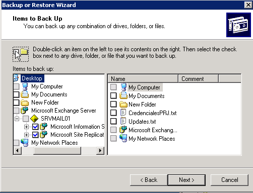 Ahora, podemos ver el árbol de directorio de nuestro servidor, expandimos la parte de Microsoft Exchange Server, ahí luego nuestro servidor(podeos ver el nombre) y luego seleccionamos los componentes (Microsoft Information Store & Microsoft Site Replication Service) y luego hacemos un clic en Next.