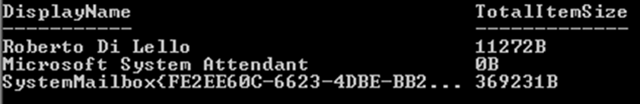 Y la otra es por medio de Exchange Management Shell (PowerShell) mediante el comando Get-MailboxStatistics y establecer la salida del informe para que muestre el valor TotalItemSize, de la siguiente forma:
