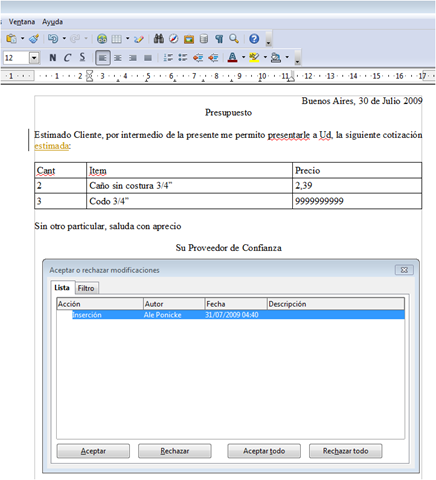 hacemos Editar / Comparar Documento y elegimos comparar contra su mellizo presup2.odt