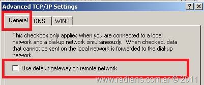 En la solapa General destildamos la opción Use default Gateway on remote network
