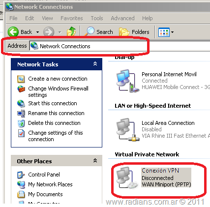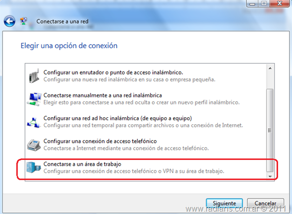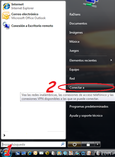 10. Luego para conectarse utilizando la conexión que creamos, debemos hacer un clic en Inicio, luego seleccionar Conectarse a (como indicamos en el paso 1) y seleccionamos la conexión VPN recientemente creada.