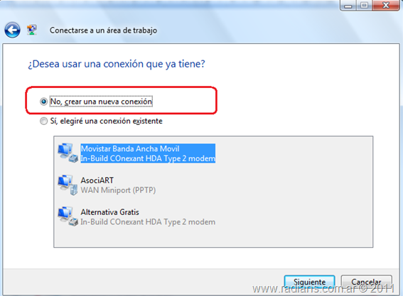 4. Si el wizard de configuración llegara a preguntar Desea usar una conexión que ya tiene?, debe seleccionamos No, crear una nueva conexión.