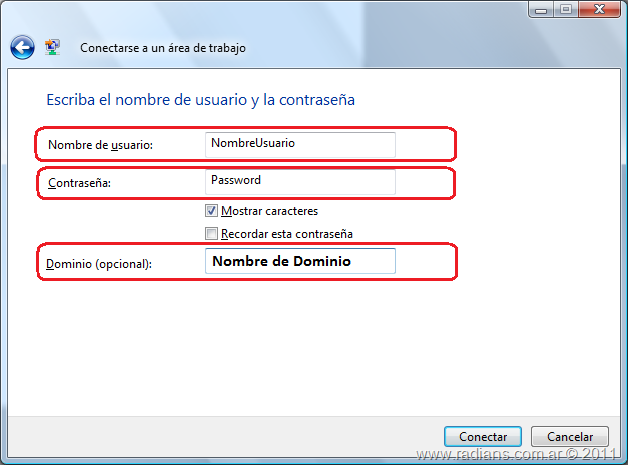 8. Ahora debemos completar las credenciales que utilizara la conexión. Es decir, nombre de usuario de red, su password y el dominio correspondiente.