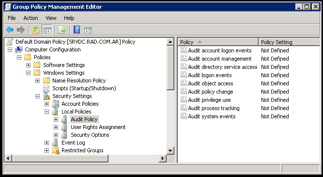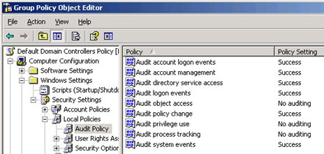 Como venimos viendo hace tiempo en el Blog, en Windows Server 2003 cuando es un domain controller, si vemos en el editor de políticas de grupo, en la sección Computer Configuration, Windows Settings, Local Policies, Audit Policy.