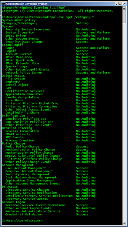 Ahora, si ejecutamos el comando auditpol.exe /get /Category:* en nuestro controlador de dominio veremos lo siguiente: