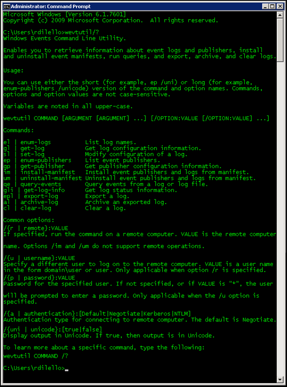 Si desean ver cada uno de los eventos asociados a las distintas subcategorías les recomiendo ver esta nota en el sitio oficial de Microsoft: Description of security events in Windows 7 and in Windows Server 2008 R2; sino también podemos generar un listado ejecutando el comando wevtutil, que nos permite recuperar información sobre los registros de sucesos y los editores, instalar y desinstalar eventos manifiestos, ejecutar consultas, exportar, archivar y vaciar/eliminar los logs.