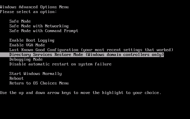 Para resolver este inconveniente vamos a tener que iniciar nuestro equipo en modo Directory Services Restore Mode, y luego vamos a realizar varias comprobaciones sobre la base de datos de Active Directory.
