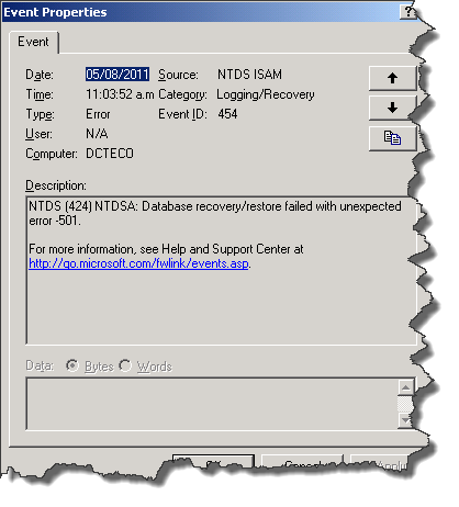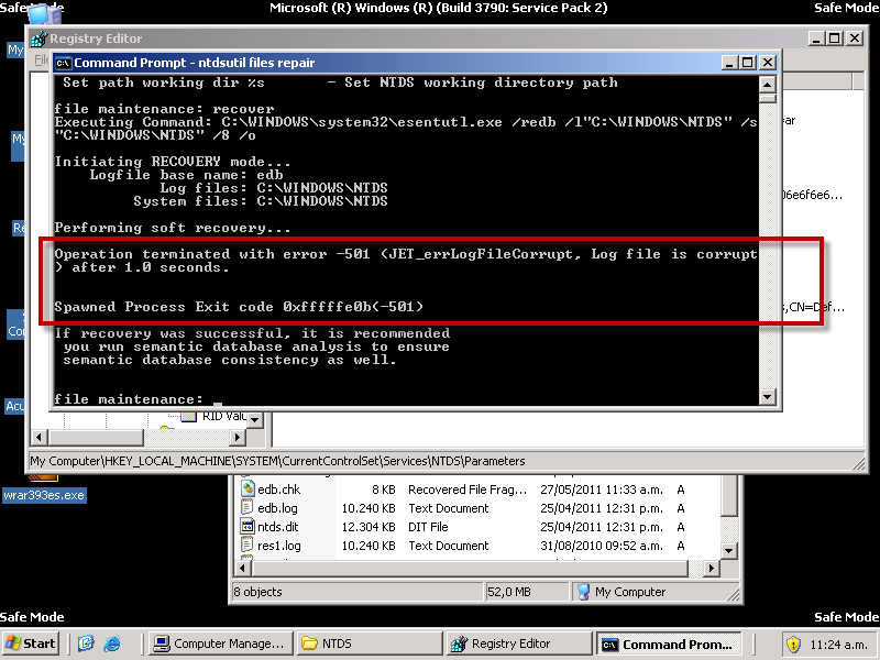 Si intentamos hacer un recovery con el ntdsutil, veremos que nos da un error en la DB: Jet_errLogFileCorrupt, Log file is corrupt.