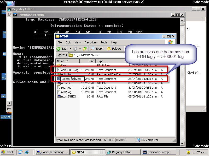 5. esentutl /p “C:\WINDOWS\NTDS\ntds.dit”, los logs cambie la extención por .bak como lo indica la página de Microsoft