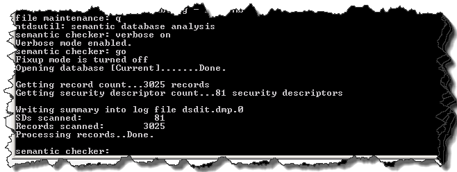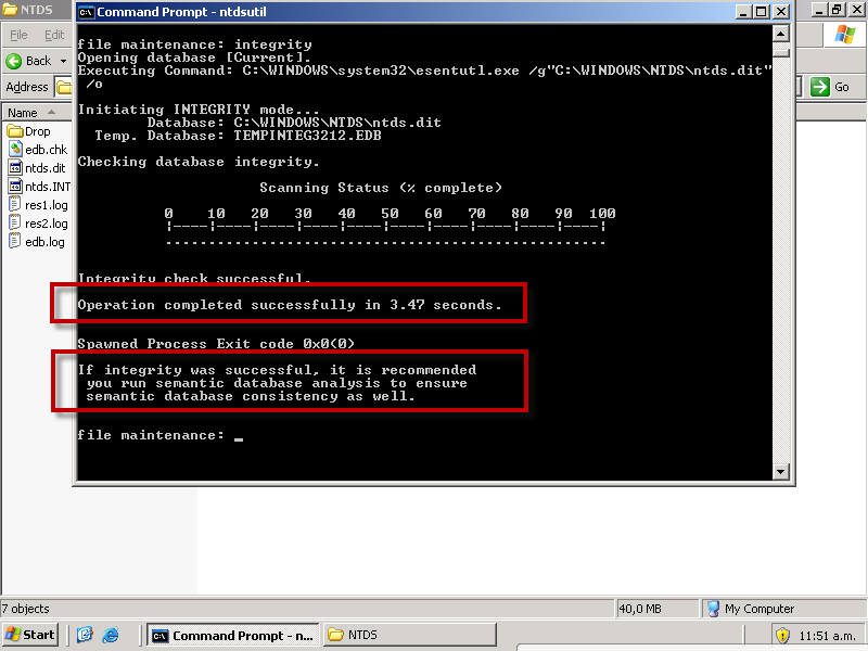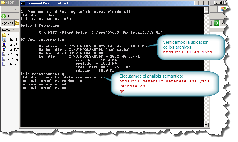 Ahora lo que vamos a hacer es verificar la integridad de nuestra base NTDIS.DIT, con el comando NTDSUTIL FILES INTEGRITY.