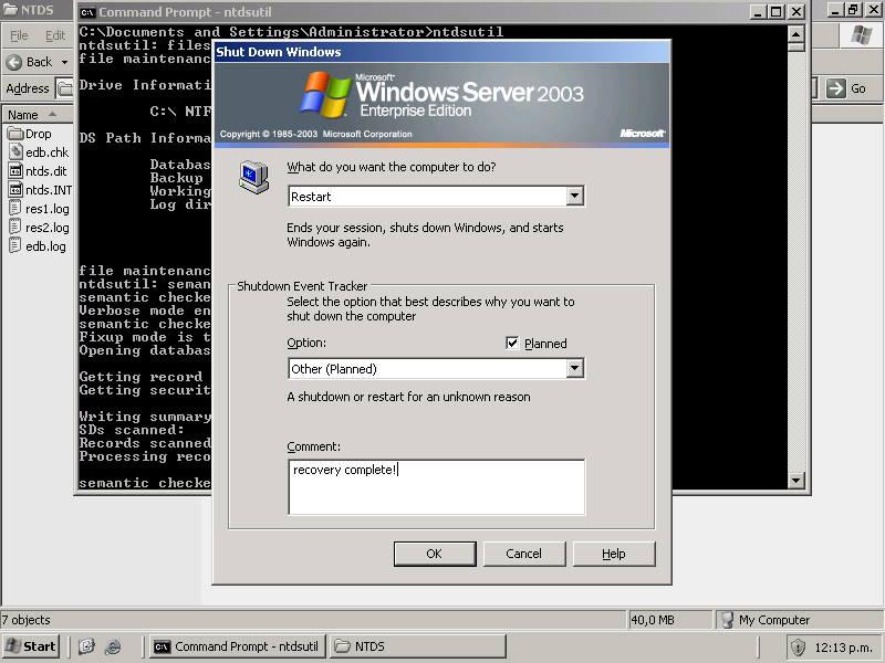Buenos Dias, me parece muy didáctico tu tutorial de restore, yo tengo un incoveniente respecto a este tema y es que he realizado el esentutl /p “C:\WINDOWS\NTDS\ntds.dit”