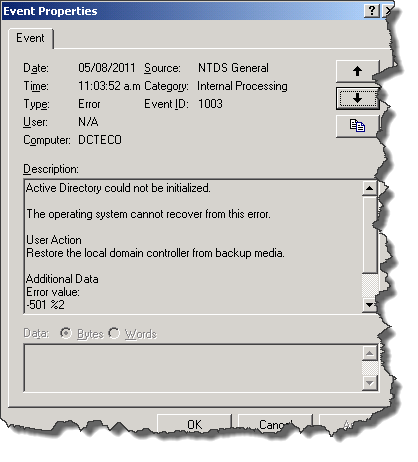 Security Accounts Manager initialization failed because of the following error: Directory Service cannot start. Error Status: 0xc00002e1. Please click OK to shutdown this system and reboot into Directory Services Restore Mode, check the event log for more detailed information.