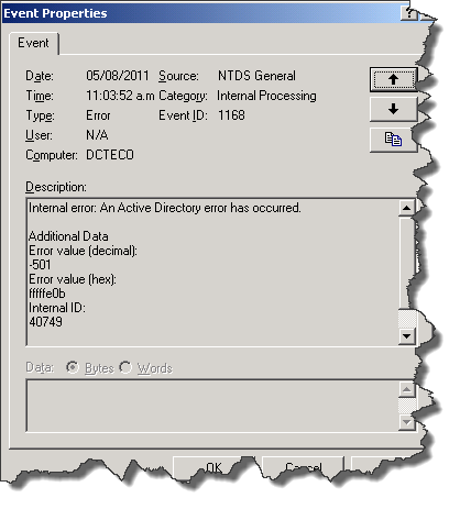 Este inconveniente puede producirse si se marcan objetos de Active Directory como autoritativo con la herramienta Ntdsutil y, luego restauramos Active Directory desde un backup. Como toda base de datos podría corromperse por varias causas, pero en nuestro caso ocurrió después que el servidor se reinicio inesperadamente 2 veces.