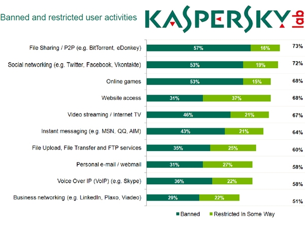 La encuesta Riesgos globales de seguridad TI llevada a cabo por Kaspersky Lab junto con B2B International indica además que el acceso a los sitios de intercambio de archivos está también vedado en la mayoría de las empresas.