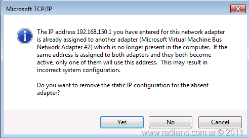 * Aparece un mensaje de error al intentar establecer una dirección IP en un adaptador de red http://support.microsoft.com/kb/269155