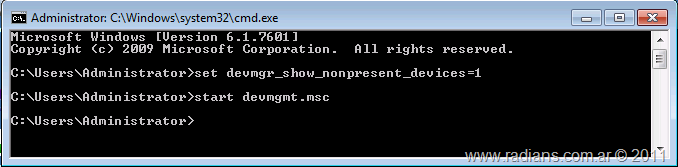 Para poder corregir este error, abrimos la consola de línea de comando cmd, y ejecutamos lo siguiente set devmgr_show_nonpresent_devices=1. Luego ejecutamos nuevamente la consola de administración de dispositivos, lo podemos hacer desde la misma ventana de línea de comando de la siguiente forma: start devmgmt.msc.