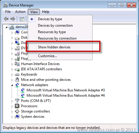 * Remove Non-Existing Network Adapters 2003 & 2008 Servers http://www.activeservers.com/Remove-Non-Existing-Network-Adapters.aspx