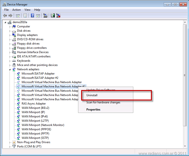 Entonces, seleccionamos cada uno de los dispositivos y los desinstalamos, haciendo un clic con el botón derecho y seleccionando Uninstall.