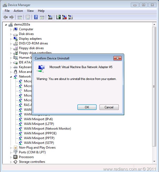 Aceptamos la desinstalación del dispositivo. Este proceso tarda unos minutos; repetimos este procedimiento para cada uno de los dispositivos de red.