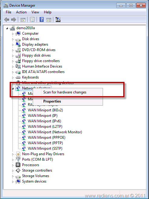 Cuando eliminamos todos los adaptadores de red, hacemos un clic con el botón derecho sobre Newtwork Adapters, y seleccionamos Scan for hardware changes.