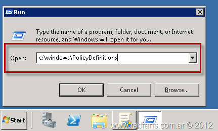 Tengamos en cuenta que nuestro equipo toma los templates que se encuentran en esta dirección, ósea que el nuevo .ADMX se instala automáticamente al instalar IE9 en el equipo que tiene instalado de GPMC. Sino, para crear objetos de la directiva de grupo (GPO) en el dominio según esta nueva configuración, tendríamos dos opciones: