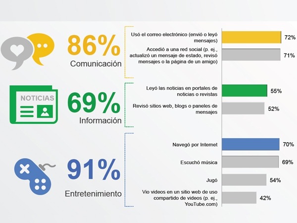 El 91% lo usa para actividades recreativas, como navegar por internet (70%); escuchar música (69%); jugar (54%); y ver videos, respuesta que obtuvo un 42% de adherentes.