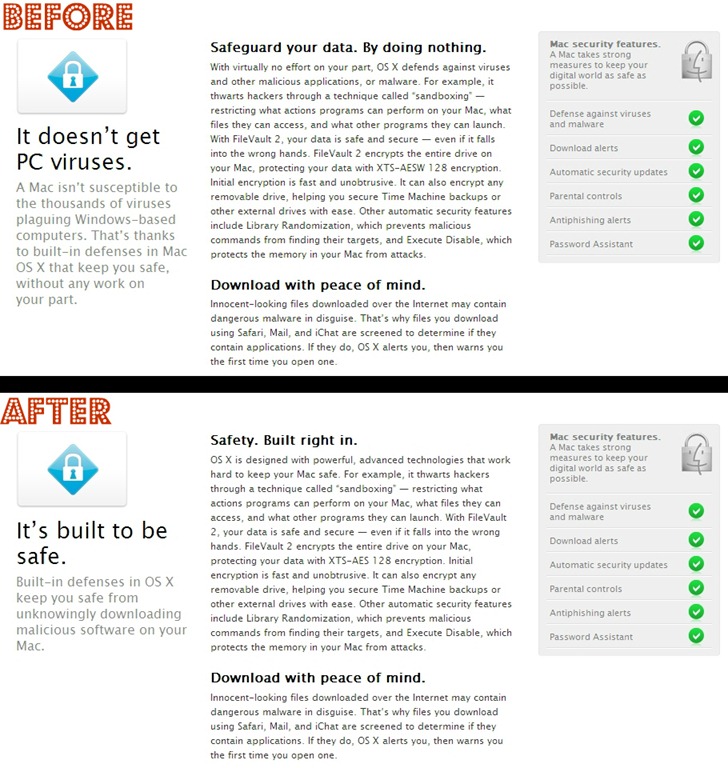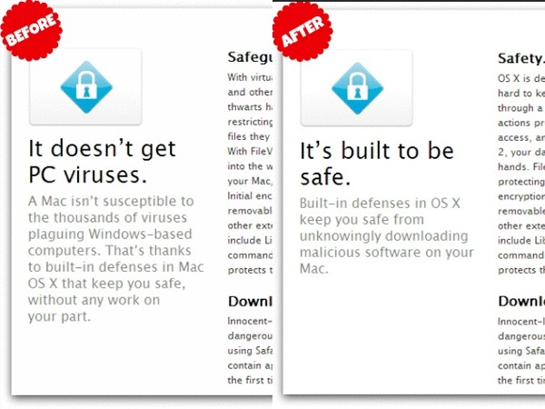 “Las Mac no son susceptibles a los miles de virus que afectan a las PC basadas en Windows”, decía Apple en un apartado. Hoy el texto fue modificado y menciona: “Las defensas de OS X permiten mantenerte a salvo de descargar software maligno”.