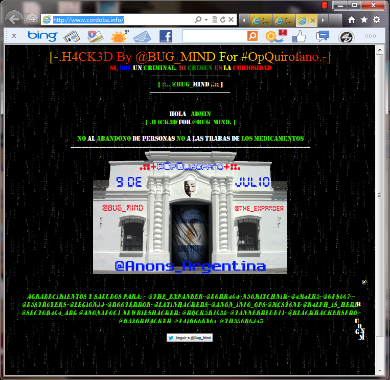 Por medio de la Operación Argentina, el grupo de hackers Anonymous se adjudicó el ataque de diversas páginas de internet, como puertomadryn.info , jujuy.net y cordoba.info, y además el del legislador Tito Nenna y el de la Subsecretaría de Comercio e Integración de Misiones, que figuraron entre las varias páginas atacadas.