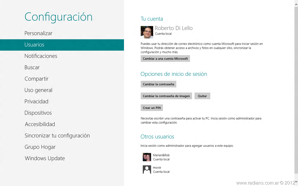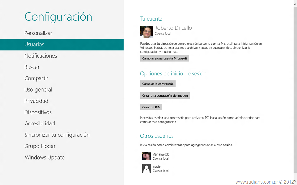 Hacemos clic en Configuración, luego Cambiar configuración de PC, para después seleccionar Usuarios.