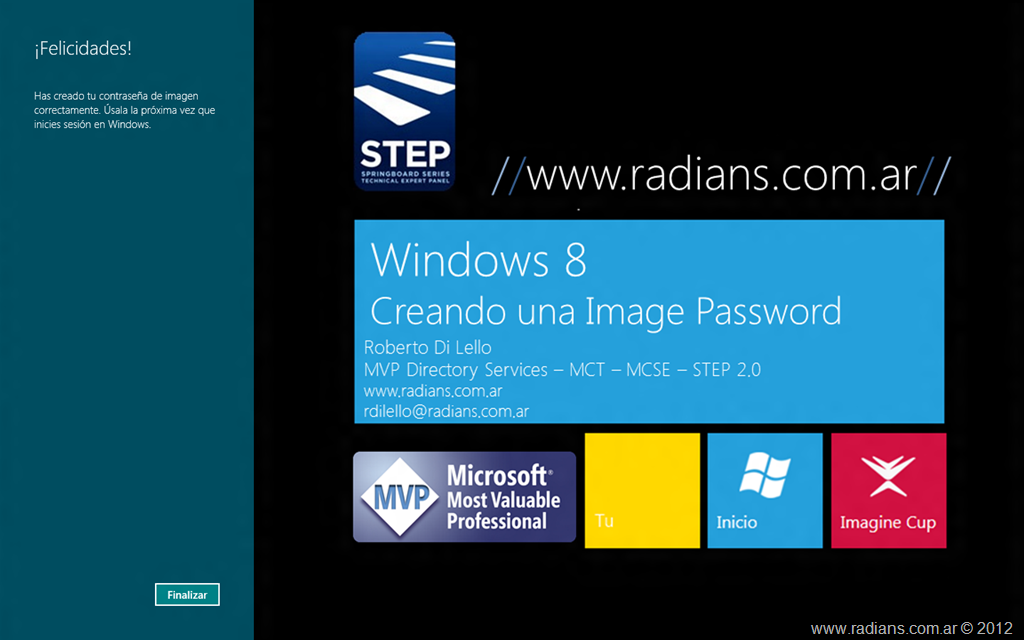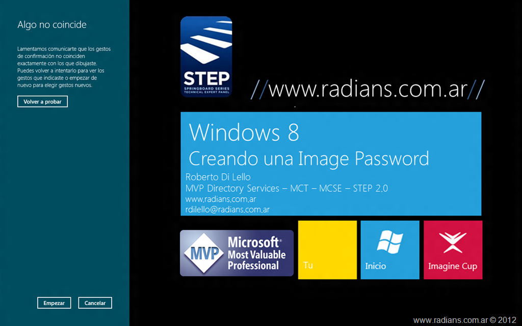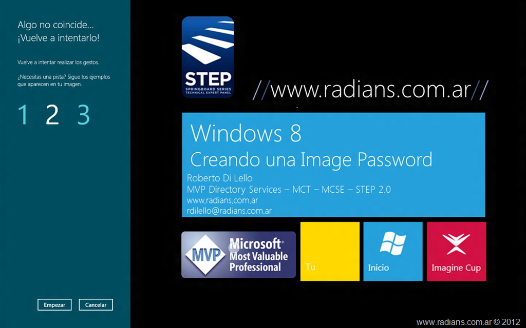 Simplemente debemos seleccionar volver a probar y listo, tendremos que volver a realizar los pasos. Entonces cuando tenemos que logearnos veremos la siguiente secuencia de imágenes, la primera es la presentación que al hacer un clic nos habilita la pantalla para ingresar nuestro password, en nuestro caso la imagen. Si hacemos los pasos correspondientes a nuestro password listo nos logeara en el equipo.