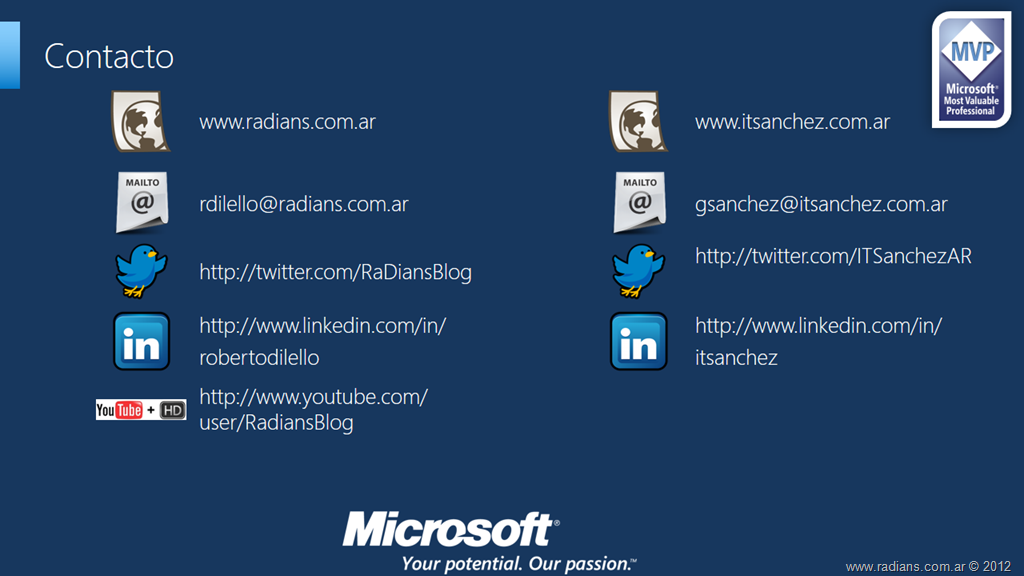 Quería compartir con ustedes la información de contacto de los oradores del evento de mañana a realizarse en Exo Trainning Center. Junto con Guillermo Sanchez estaremos presentando Windows Server 2012 y veremos algunas de las nuevas características, como ser: