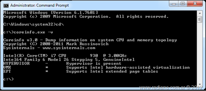 Ahora como verificamos si efectivamente vamos a poder o no ejecutar HyperV en nuestros equipos? Bueno, la solucion es verificar con una utilidad de SysInternals, el CoreInfo si nuestro procesador nos permitira o no utilizarlo.