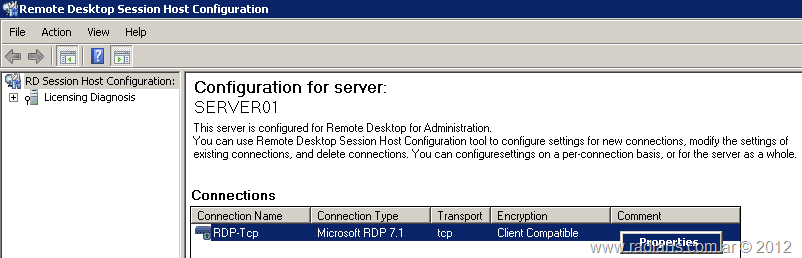 Una vez en la consola, seleccionamos la conexión RDP-Tcp y seleccionamos las Propiedades.