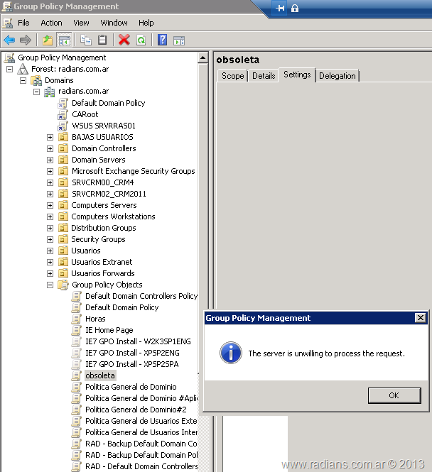 Hoy quería escribir sobre este Error “The server is unwilling to process the request” al borrar una política, no es algo común pero he visto varios Active Directories con el. Primero que todo vamos a ver cual es el “síntoma”: tenemos una política en nuestro dominio, que al querer borrarla nos da este error, como podemos ver en la siguiente captura: