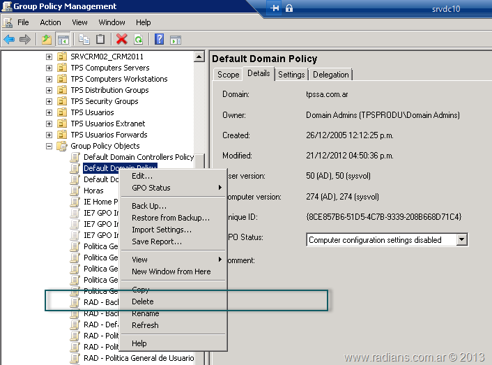 En nuestro ejemplo, la política en cuestión es la llamada “obsoleta”. Cual es la causa? bueno, la causa es que estamos borrando una política default ya sea la “Default Domain Policy” o la “Default Domain Controllers Policy”. Generalmente pasa que algunos administradores modifican en exceso las políticas default y luego como no pueden solucionar un problema en particular la renombran y generan otra con el mismo nombre. ERROR, ya que su ID de referencia no cambia, por lo cual sigue siendo la política renombrada la política por default.
