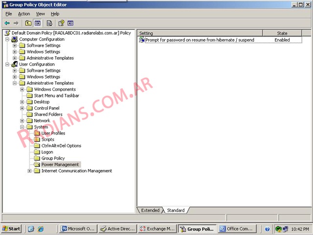 1) Group Policy, Windows Settings, Administrative Templates, System, Power Management, Prompt for password on resume from hibernate /suspend.
