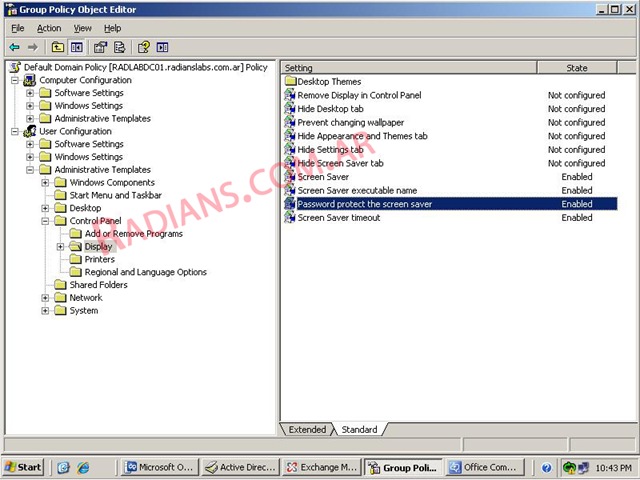2) Group Policy, Windows Settings, Administrative templates\control panel\display\password protect the screen saver and screen saver timeout.