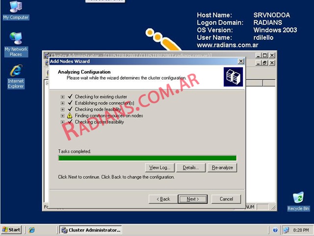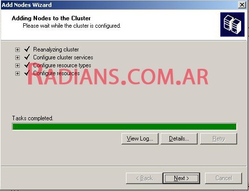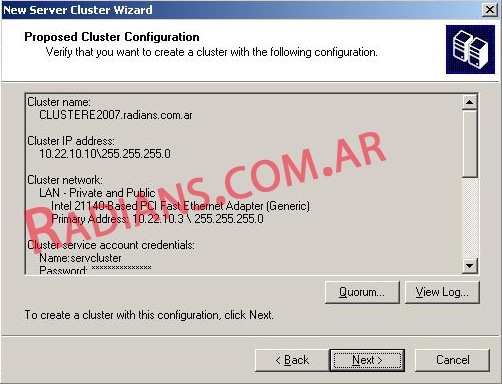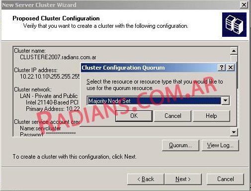 Seleccionamos nuestro dominio, en nuestro caso RADIANS.COM.AR, y escribimos como queremos que se llame nuestro cluster, CLUSTERE2007.