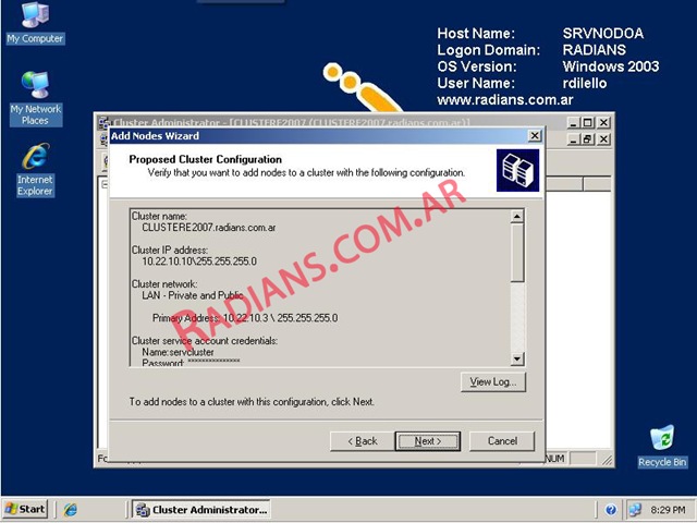 Ingresamos los datos de la cuenta con la cual se ejecuta el servicio de cluster, en nuestro caso es la cuenta srvcluster del dominio radians.com.ar.
