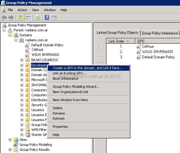 Seleccionamos la OU a la cual le vamos a aplicar nuestra política, en nuestro caso es la llamada “Developers”. Hacemos un clic con el botón derecho sobre ella y seleccionamos “Create a GPO in this domain, and Link it here…”.