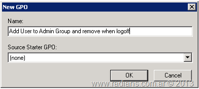 Luego ingresamos el nombre de nuestra politica: “Add User to Admin Group and remove when logoff”, y luego, OK.