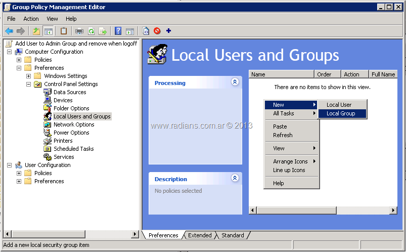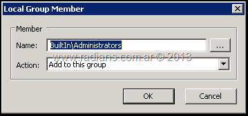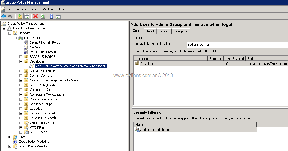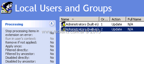 Con esto se añade automáticamente un grupo de dominio llamado "dominio\nombreDeEquipo Administradores" al grupo de administradores locales en el equipo al que se aplica la política. Sin embargo, el grupo de "radians\DSKDEV01 Administradores" sólo se agrega al grupo de administradores locales en el equipo DSKDEV01 si ese grupo ya existe. Por lo tanto no es necesario para crear el grupo hasta que surja la necesidad de agregar un usuario o grupo individual a un solo equipo. Una vez creado el grupo podeos agregar un solo usuario o muchos (o grupos) al grupo de dominio.