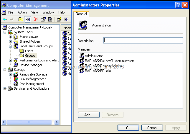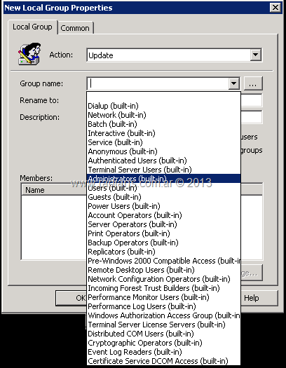 Ahora tenemos que seleccionar el grupo "Administrators (built-in)", debemos hacer esto incluso si hemos cambiado el nombre para ocultar el nombre de la cuenta de administrador. Tanto en la seccion “Group Name” como en el area “Members”.