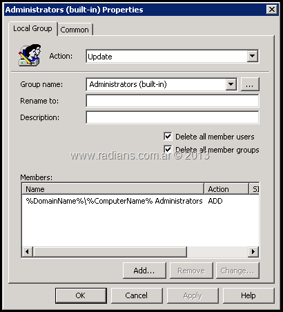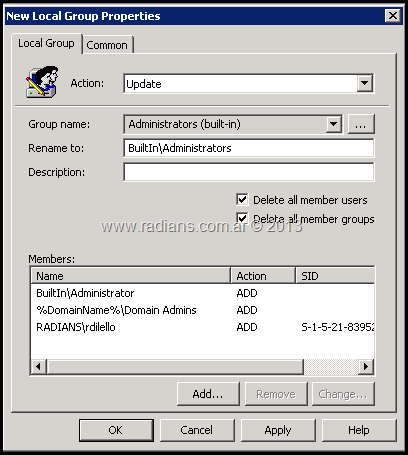 Entonces, el nombre del equipo es DSKDEV01 y el nombre de dominio es RADIANS, queremos añadir el grupo "radians\DSKDEV01 Administrators" al grupo de administradores local, pero también queremos que ocurra lo mismo en DSKDEV02, DSKDEV03 y así sucesivamente. Para ello, creamos otro Local Group, y agregamos en la sección Members la entrada %DomainName% \ %ComputerName% Administrators.; con esto creamos una segunda entrada.