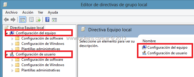 Otra causa, generalmente es, que la configuración de la política esta definida para el tipo de objeto incorrecto. Cuando editamos una GPO hay dos secciones distintas para las que se pueden editar: Computer Configuration y User Configuration.