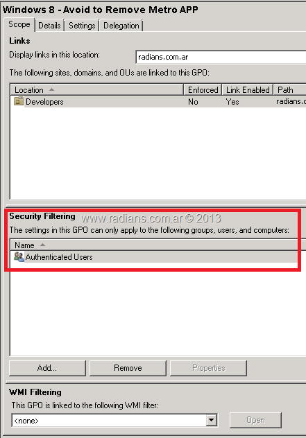 Otra cosa común es que no se verifique el Filtrado de seguridad de la GPO. Es decir, que la política creada aplica a otro grupo de usuarios en el que no se encuentra nuestro equipo/usuario. Recordemos que cada GPO tiene su seguridad definida, a esto lo llamamos Filtrado de Seguridad. Esto no es otra cosa que una ACL la cual podemos customizar a nuestro gusto, y por ende podemos cometer errores en ella. No es difícil de utilizar, ya que en definitiva es aplicar permisos, pero suele ser otro error.