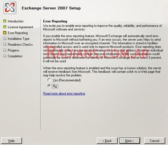 3. Ahora debemos seleccionar si queremos enviar el reporte de errores, en nuestro caso seleccionamos que no y hacemos un clic en el boton Next.