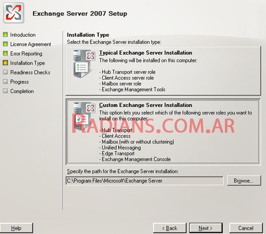 4. En el tipo de instalacion, ya que debemos implementar algunos roles en particular, seleccionamos Custom Exchange Server Installation.