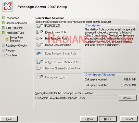 5. En la seleccion de Roles, hacemos un clic sobre Hub Transport Role y sobre Client Access Role. Luego hacemos un clic sobre el boton Next.